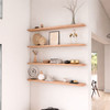 It’s no surprise that genuine solid red oak is a favorite for our custom products. You’ll be captivated by its straight, open grain and rich natural color—ranging from soft pinkish-red and honey tones to deeper reddish-browns—often highlighted by prominent rays. Red oak’s classic character, paired with its strength and durability, makes it a beautiful and reliable choice for custom floating shelves.
